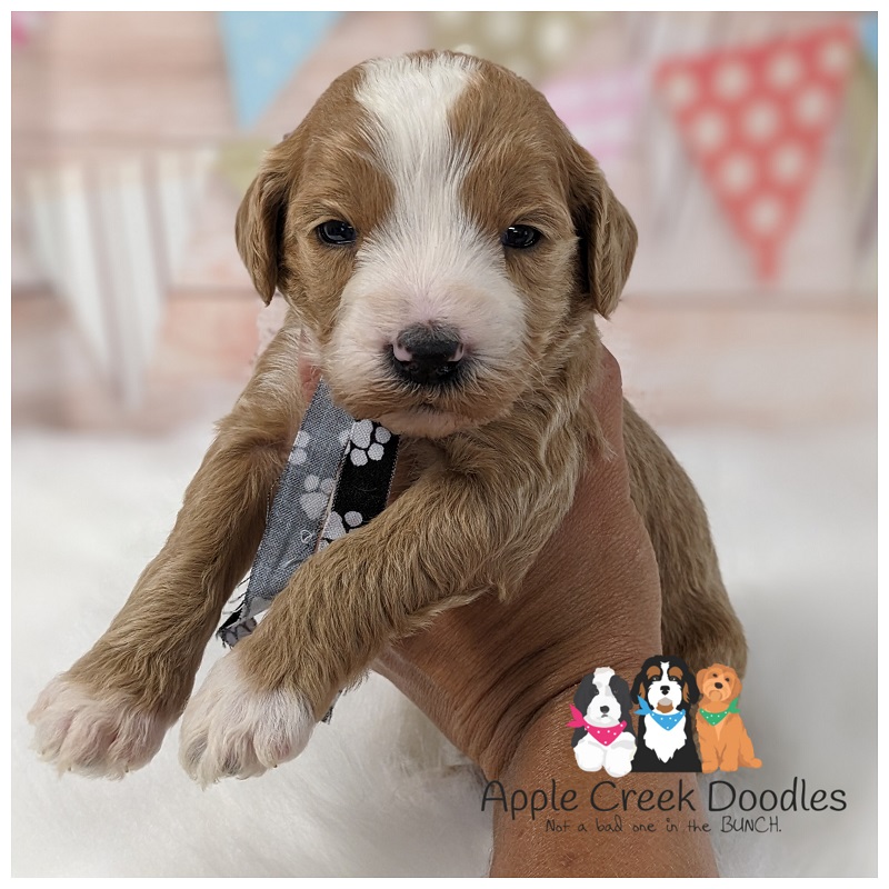 BLACK RIBBON BOY – AVAILABLE -Currently weighs 2lb 4oz. His coat is dark golden in color and has a soft curly texture, he has a huge white blaze up his face, big white chest spot, all 4 feet are white and he has a mustache of color. He’s $3000.