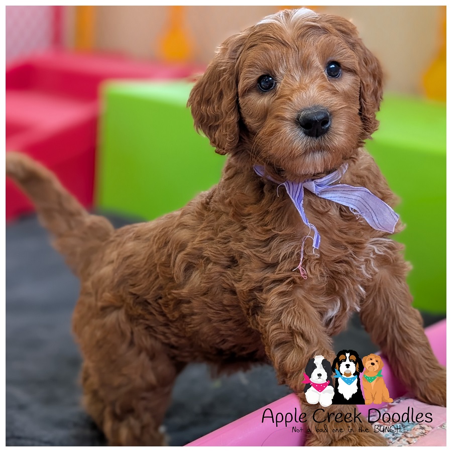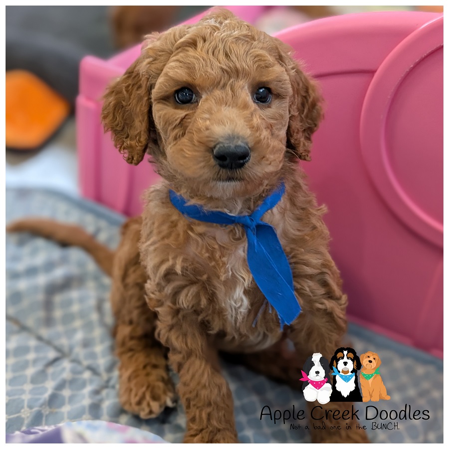 F1b English Goldendoodle – Wavy coat, darkest of the bunch.