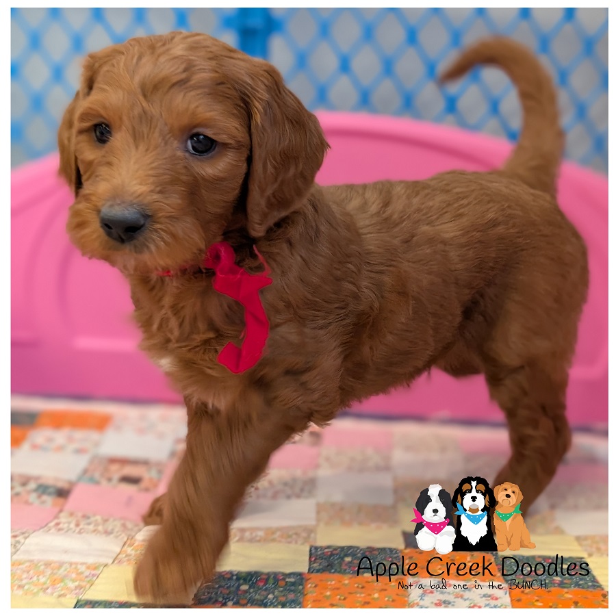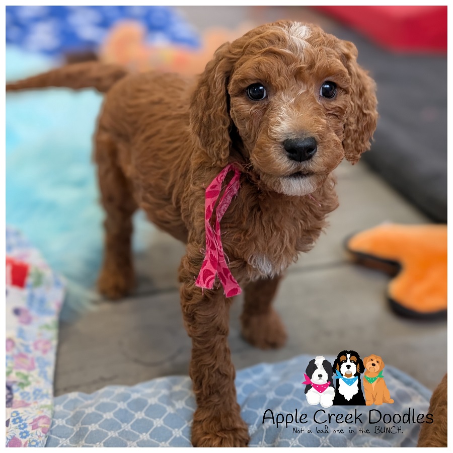 F1b English Goldendoodle – Wavy coat, nice dark red with white star on her head.