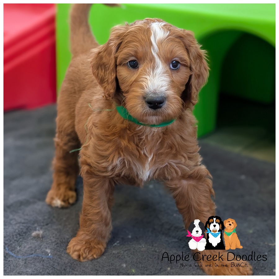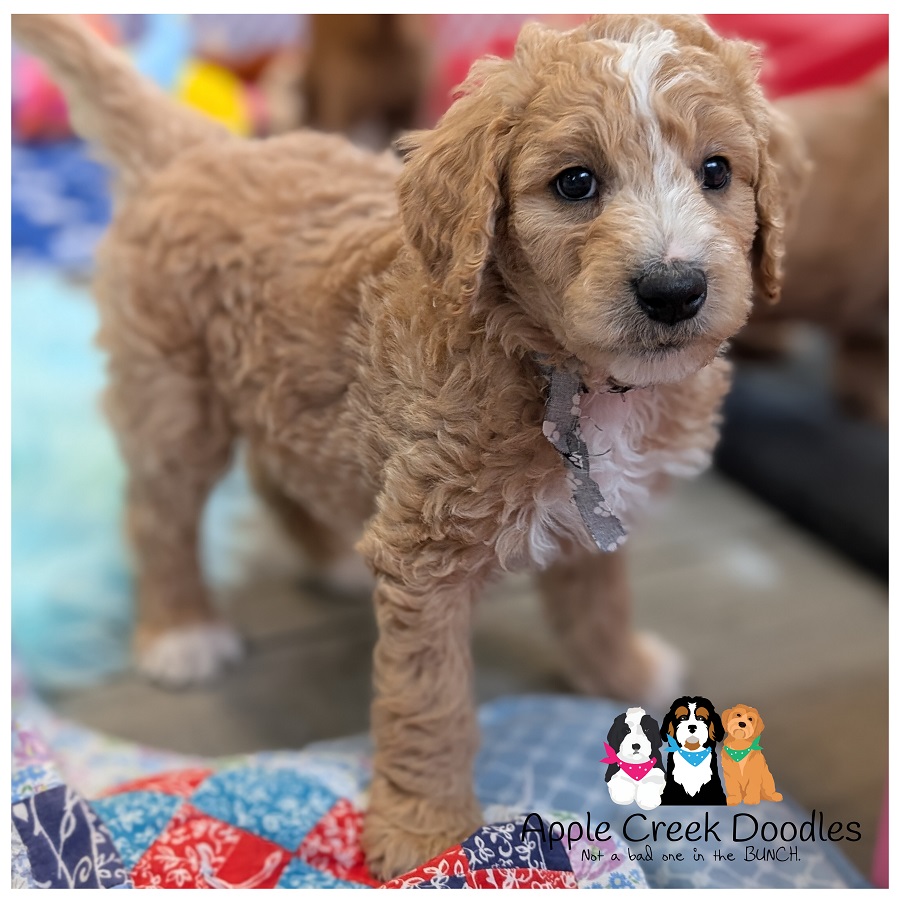 F1b English Goldendoodle – Curly coat with nice white markings.