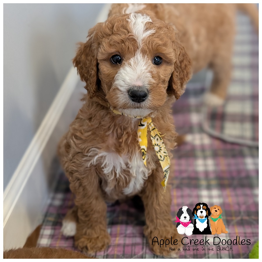 F1b English Goldendoodle – Curly coat with white blaze on face and her chest.