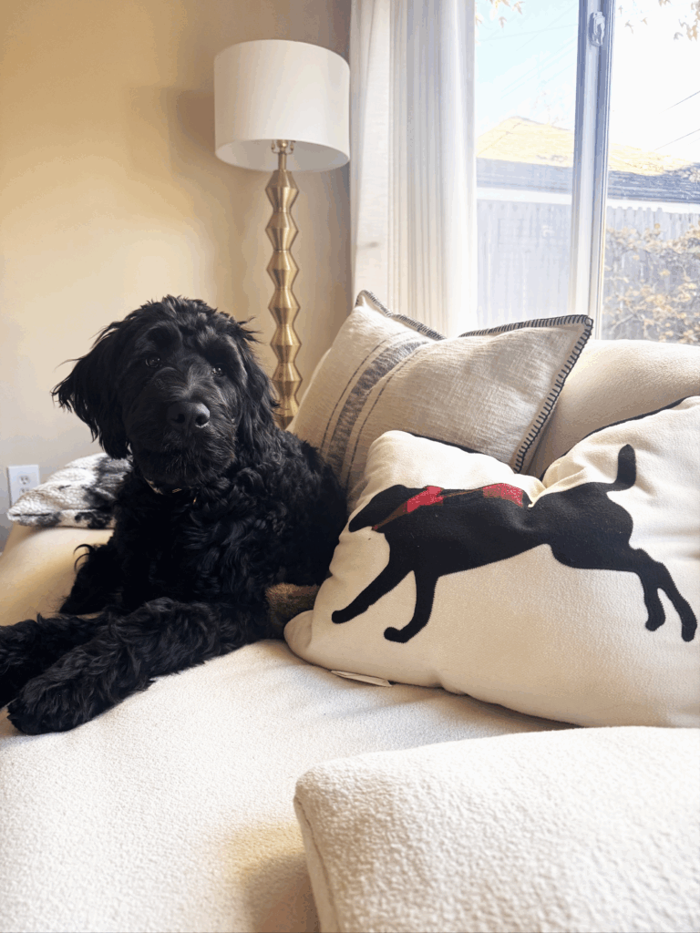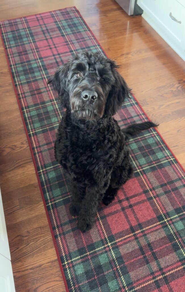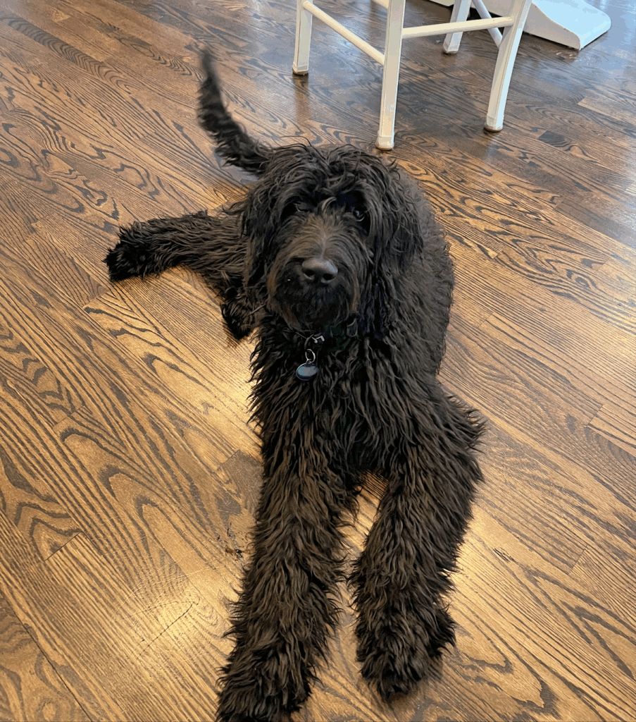“Hi Tara, Just wanted to send a pic of Poppy She is amazing and we are totally in love”….Poppy is a black phantom F1 English Goldendoodle from Kit and Leo’s prior litter. She loves playing with her Sheepadoodle sister Parker. They get along great.