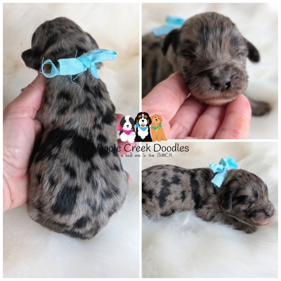 F1 English Goldendoodle Puppies – Blue merle in color with a wavy coat.