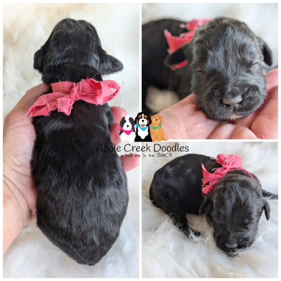 F1 English Goldendoodle Puppies – Black in color with a wavy coat.