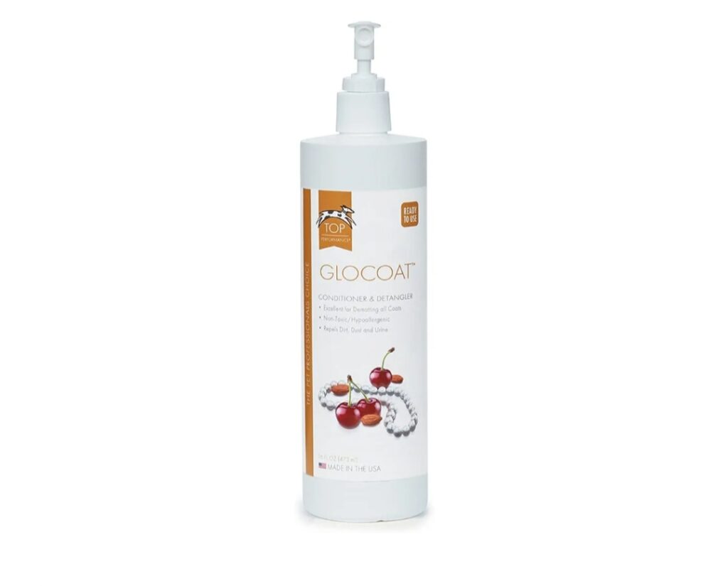 Dematting spray, a good product to use after your pups bath. Spray on when your pup is wet and use your slicker brush to brush through. I find it’s easier to brush through dogs coats when they are wet. Once they are dry they will be so soft, once dry brush them with your slicker brush again. Glo Coat Spray.